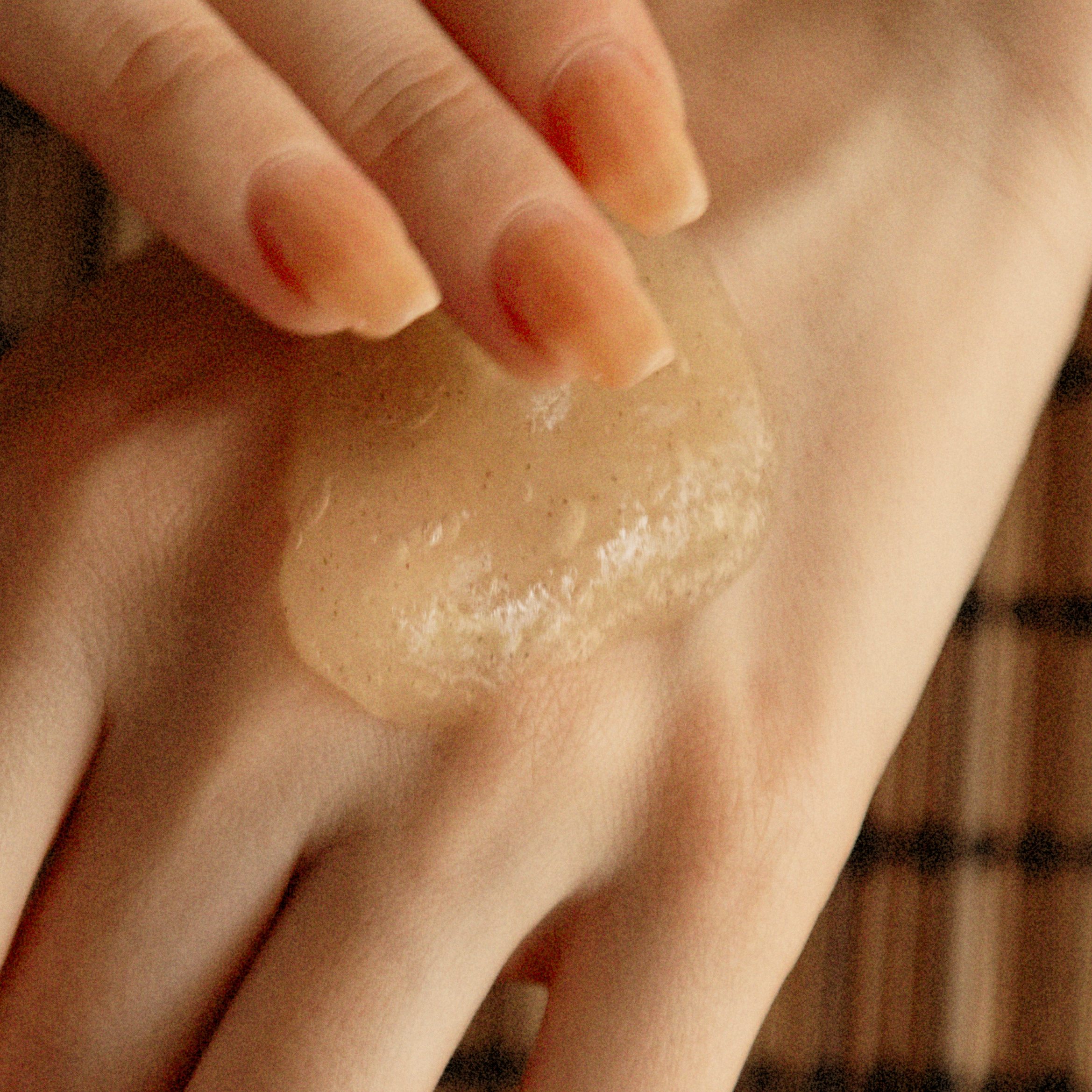 こんにゃくとアンズのスクラブ洗顔料。ジェリー状のウェットなテクスチャーは、お肌に負担をかけずに毎日でも使え、角質に溜まった不要な皮脂や汚れを優しく取り除き、艶のあるクリアなお肌へと導きます。